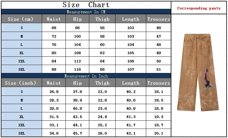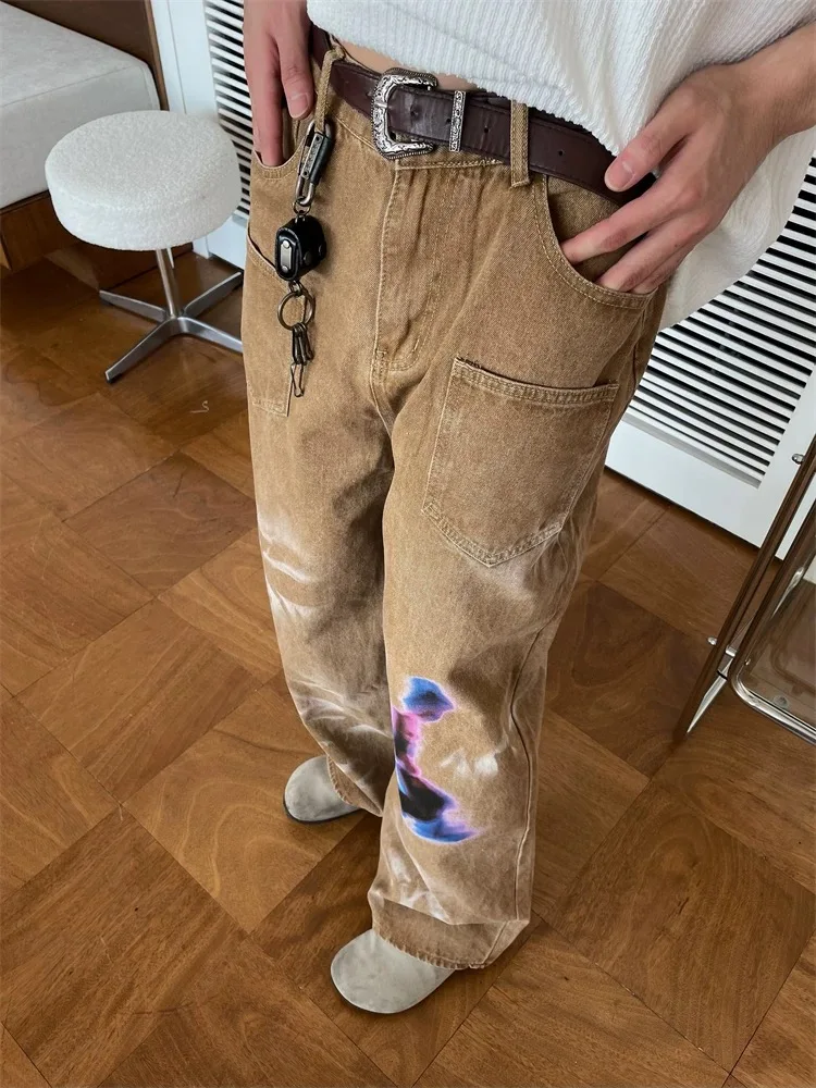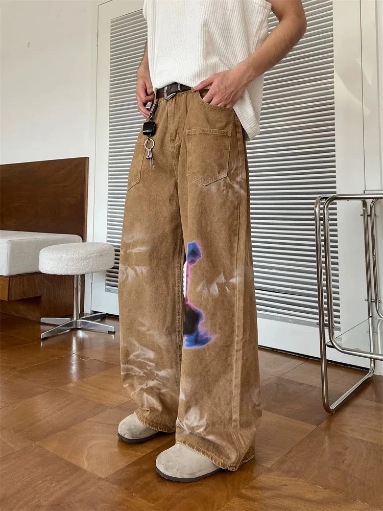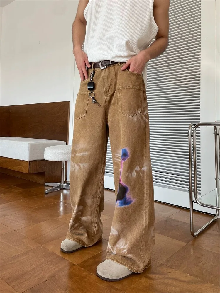 Make a bold statement with these light brown baggy jeans, featuring a unique splash ink design and distressed details. The relaxed fit and wide-leg silhouette offer ultimate comfort while adding an artistic edge to your streetwear look.